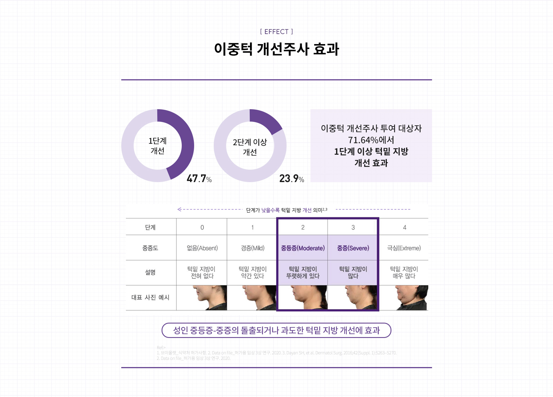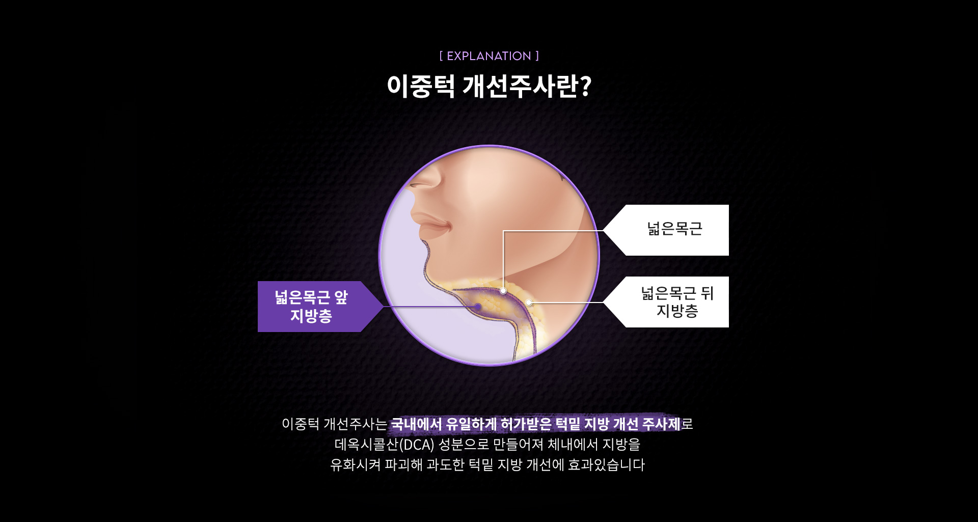 이중턱 개선주사는 데옥시콜산(DCA) 성분을 이용한 주사 시술로, 이중턱 지방 제거에 효과적입니다.